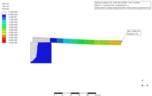 In order to verify the non-linearity of the material in large deformations, I conducted Finite Element (FE) analysis using an elongated plastic flat bar supported on metal blocks at both ends, with a constant load applied to the central part using PreProMax. The results are shown below.