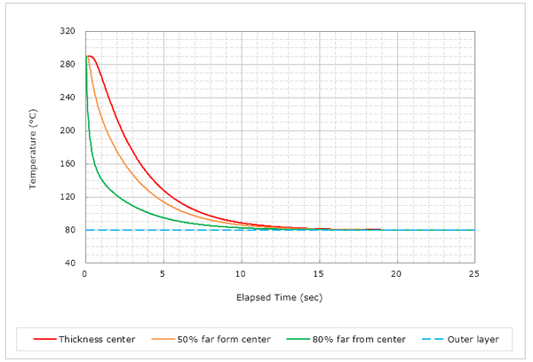 上の図は横軸に時間を、縦軸に温度をとって、経過時間とともにある温度に触れた溶融樹脂の温度が推移していく様子をプロットしたものです。入力項目は初期の溶融樹脂温度、金型温度、成形品の肉厚、樹脂の熱伝導率、および比熱になります。出力は温度ですが、赤実線は肉厚中心、オレンジが肉厚中心から 50% 外側の点、緑の実線は肉厚中心から 80% 外側の点、そして水色の破線は最表層の温度を示し、ここは金型温度と同じ温度で終始一定となります。今回の例として、樹脂温度は290°C、金型温度は 80°C、熱伝導率は 0.2 W/m-K、比熱は 1200 J/kg-K、肉厚は 2 mm を入力しました。