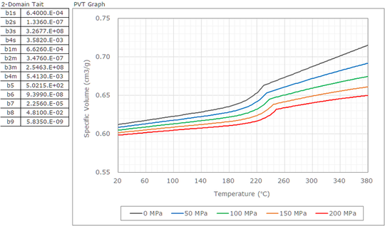 ところで Tait 式のパラメーターを見ると、b7 ~ b9 の値に数字が入っています。非晶性材料ではこれらの値はすべて 0 でした。この部分がグラフ上で体積が急激に低下している部分を表します。