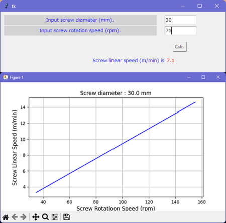 Therefore, this time, I'd like to calculate the screw peripheral speed from the screw outer diameter and rotation speed. The calculation itself is simple, simply (Perimeter Length) x (Rotational Speed), but I wanna create a program using "python" to calculate it. Use "tkinter" to display the input items in the library and prompt for input, and when the inputs were completed, after displaying the calculated peripheral speed, wrote a program to graph the input rotation speed using "matplotlib" library. Running this will output the result shown in the figure on the left. At this time, in order to display the graph, "tkinter" screen must be closed by pressing the "X" button. With this, the calculated value disappears at the same time as the graph appears. In order to fix this, it seems that I have to learn more syntax.