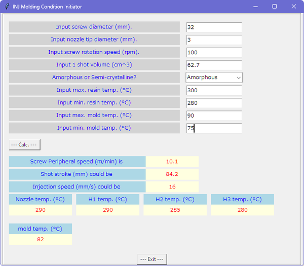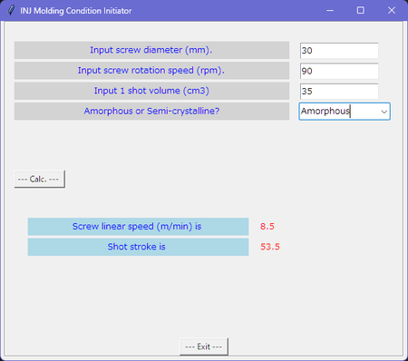 Well, above is the software using example for setting the initial conditions at the first trial of injection molding using python that I created this time. In the above example, the resin used was an amorphous resin, and the melting temperature and mold temperature were entered appropriately. Plus, you can set 30 MPa as holding pressure 1 s for the time.then set 1 mm as suck back.