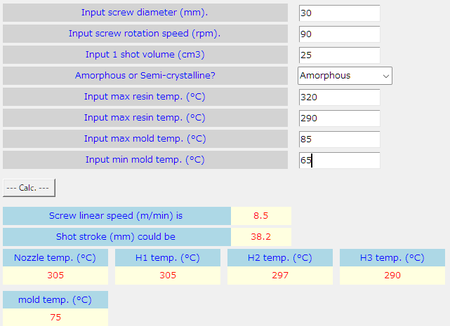 さて、以上が今回制作してみた python を使用した、射出成形の初回トライ時の初期条件設定用のソフトの使用例になります。上記では使用樹脂は例として適当に非晶性樹脂として溶融温度と金型温度を適当に入力しましたが、いかがでしたしょうか? これらのアウトプットの他に、保圧を 30 MPa、保圧時間 1 s、サックバックを 1 mm 程度に設定すればいいでしょう。