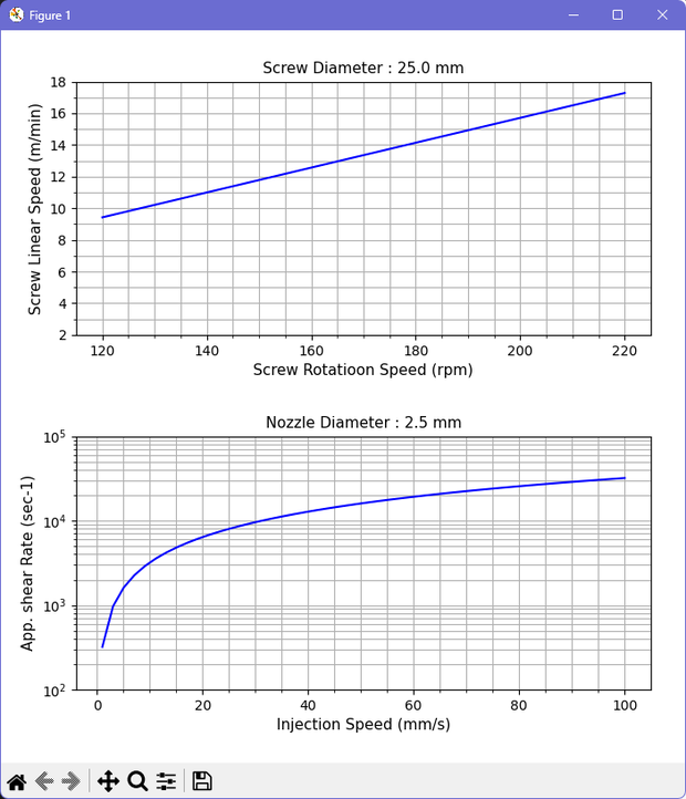 When python is run, the rotation speed of the screw and the "apparent shear rate at the nozzle", which is simply calculated assuming that the melt resin is a Newtonian fluid, are graphed at the same time as the above outputs. Two graphs are drawn, the upper one is the screw speed and the lower one is the shear rate at the nozzle. While looking at these, I think it would be good to adjust the conditions while imagining what the current conditions are positioned.