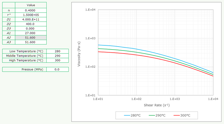 The figure on the right is a graph of shear rate and viscosity at three temperatures using this Cross-WLF equation, using Excel. It uses eight constants, as shown. However, here I entered arbitrary values.