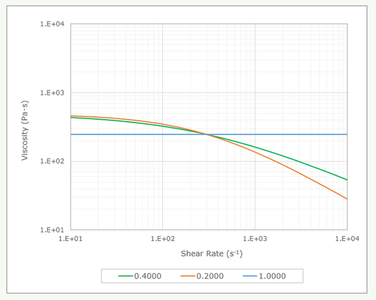 ちなみに、Cross-WLF 定数のうち n はべき乗指数を表し、この値が小さくなると直線部の勾配が増します。右図は n の値を 0.4, 0.2, 1.0 と変えてグラフを描きました。n が 0.2 の時は 0.4 のときと比べて傾きがきつくなることが分かります。また、1.0 の時は傾きがなくなり、せん断速度の影響が見られなくなります。このような液体はニュートン流体と呼ばれます。
