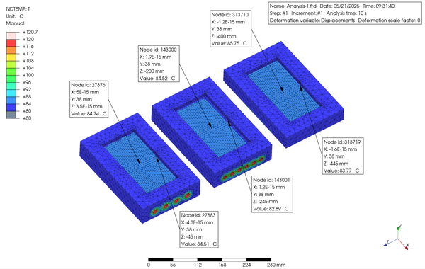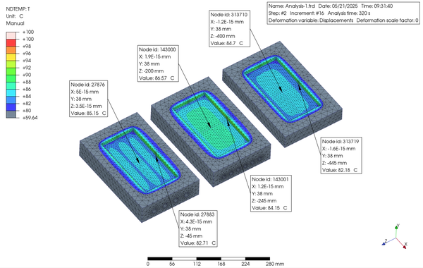The analysis conditions are as follows: First, in Step 1, the temperature and heat transfer coefficient of the contact plane with the mold base were set to 80°C and 1 mW/mm2⋅°C, the temperature and film heat transfer coefficient of the parting plane were also set to 80°C and 1 mW/mm2⋅°C, the temperature and film heat transfer coefficient of the cavity surface were set to 25°C and 0.05 mW/mm2⋅°C, and the temperature and film heat transfer coefficient of the water channel surfaces were set to 120°C and 100 mW/mm2⋅°C. Next, in Step 2, the temperature and film heat transfer coefficient of the cavity surface were changed to 300°C and 0.1 mW/mm2⋅°C. At the same time, the temperature and film heat transfer coefficient of the water channel surfaces were changed to 60°C and 100 mW/mm2⋅°C. The temperature progression of the insert was simulated in each step for 160 seconds. The material used for the insert was S420 from the PrePoMax database.
