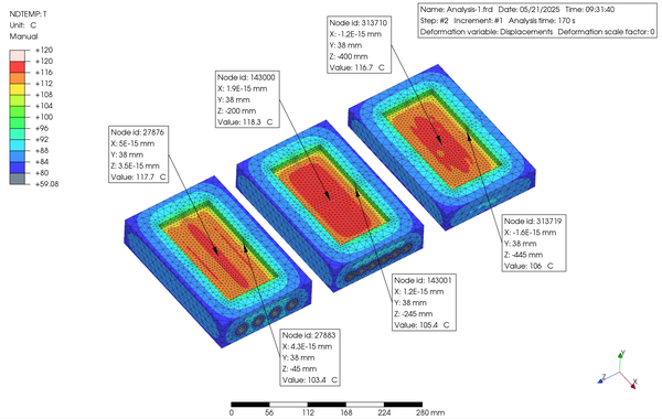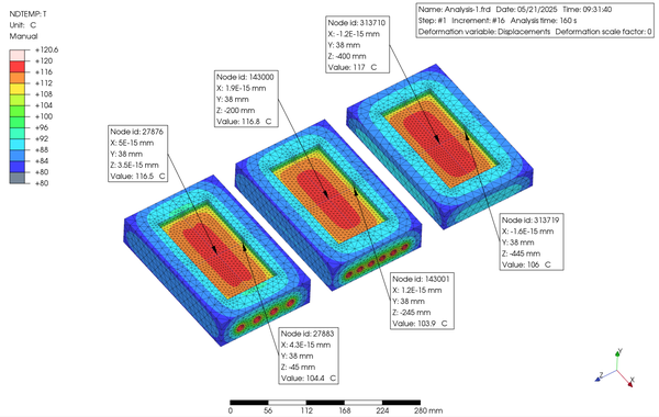 まず、Step 1 は、モールドベースとの接触面の温度と熱伝達率は 80°C, 1 mW/mm2⋅°C、パーティング面の温度と境膜伝熱係数を同じく 80°C, 1 mW/mm2⋅°C、キャビティ表面部分の温度と境膜伝熱係数は 25°C, 0.05 mW/mm2⋅°C、そして水管の表面の温度と境膜伝熱係数を 120°C, 100 mW/mm2⋅°C と設定しました。次に、Step 2 として、キャビティ表面部分の温度と境膜伝熱係数を 300°C, 0.1 mW/mm2⋅°C、水管の表面の温度と境膜伝熱係数を 60°C, 100 mW/mm2⋅°C に変化させて、それぞれの Step を 160 秒間として入れ子表面の温度変化をシミュレートしてみました。なお、入れ子の材質は PrePoMax のデータベースから S420 を選択しました。