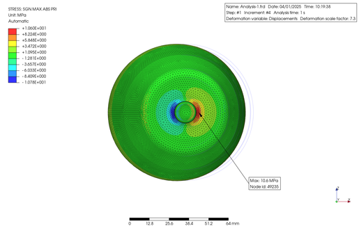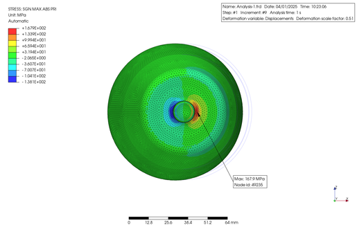A 1/4 finite element model of the above housing was created with a thickness of 0.8 mm, and then a load of 0.1 MPa was applied to the central part with a diameter of 20 mm. The vertical deformation was calculated by static analysis using PrePoMax. In this case, the material is assumed to be metal, with a Young's modulus of 210 GPa, a Poisson's ratio of 0.28, and a density of 7.8 g/cm3.