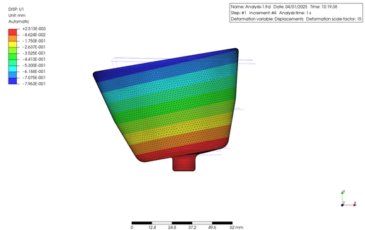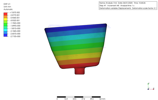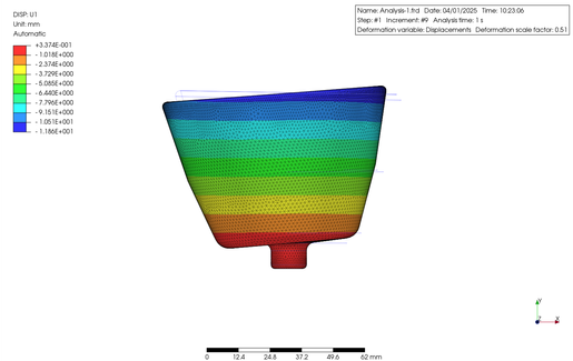 The part was made of ABS resin and rotated at 800 rad/s along the bottom cylindrical portion. The properties of ABS were extracted directly from the PrePoMax database. The results are as follows. The figure shows a contour plot of the displacement along the U1 axis (X-axis) and the maximum principal stress.