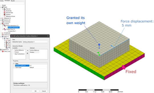 今回の解析は、材質が金属 (S185 : PrePoMax の材料データベースの値をそのまま使用) の板の上に、同じく S185 のブロックを置き、板の一端を固定したうえでブロックの端を5 mm 変位させた時の拘束点の生じる最大反力を出力することとしました。この時、解析において、接触面の Friction Coefficient を 0.1, 0.2, 0.3, 0.4 と変化させた時に、上述の反力がどのように変化するかを確認しました。PrePoMax における Friction Coefficient はおそらく摩擦係数的なものを表現するために用いられるものと思われますが、この値が反力にどのように影響を及ぼすでしょうか? 作成した有限要素モデルと解析条件の設定を図に示しています。