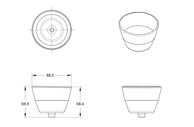 円筒形状で、さらに底部に同芯の円筒をもつ物体を、回転させた時に発生する応力と変形をシミュレーションしてみます。使用した形状は、図に示すようにコップのような形をしていますが、底部には円筒部部を有します。肉厚は 2.5 mm です。高さを見ると、左右で違いがあり、これによって回転した時に重心にズレが生じます。