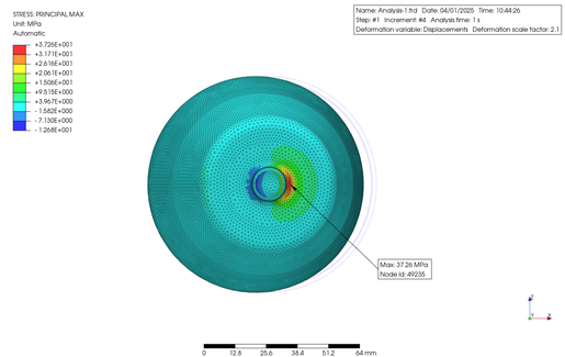 この物体の材料を ABS 樹脂として、その底円筒部の外周に沿って 800 rad/sec で回転させてみました。この時 ABS の特性は PrePoMax のデータベースをそのまま用いました。その結果を下に示します。表示は U1 軸 (X 軸) 方向の変位と最大主応力の等高線図になります。