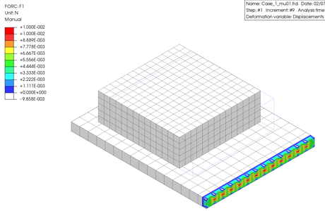 結果として、Friction coefficient の値を 0.3 としたときの X 軸方向の反力コンター図を示します。また、それを変化させて、最大反力をグラフ化して表示します。