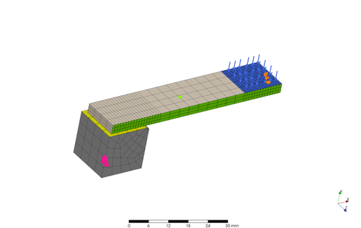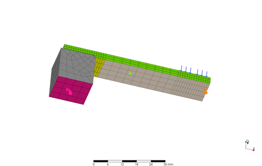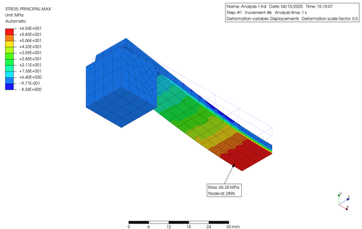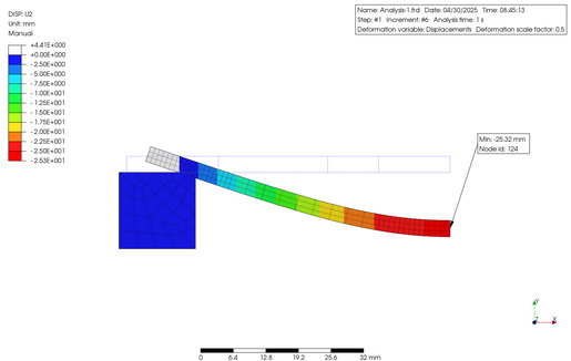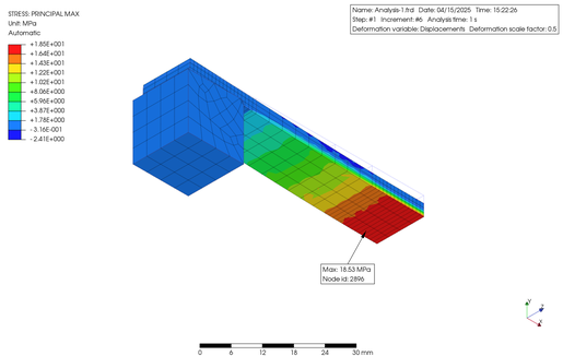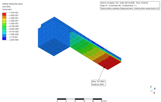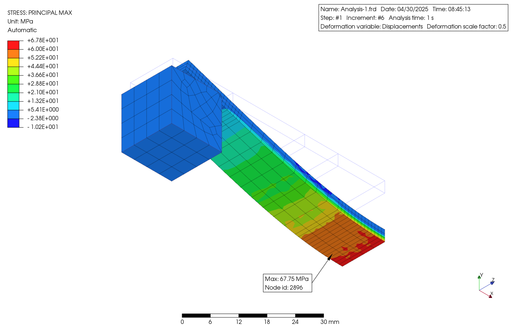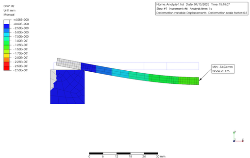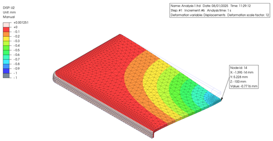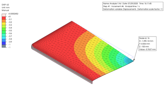In order to verify the non-linearity of the material in large deformations, I conducted Finite Element (FE) analysis using an elongated plastic flat bar supported on metal blocks at both ends, with a constant load applied to the central part using PreProMax. The results are shown below.