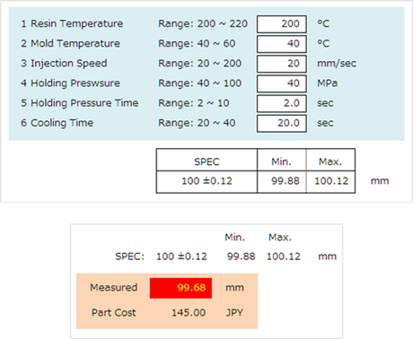 今回、右図に示すような Excel Sheet を用意しました。表中に成形条件を入力すると、仮定として、それらの条件に基づいて成形されたパーツの寸法が表示されるようになっています。もちろん擬似的なものですが、この得られた寸法値をスペック内に収められる最適条件を、統計的手法を用いて見つけていくトライをしてみたいと思います。