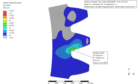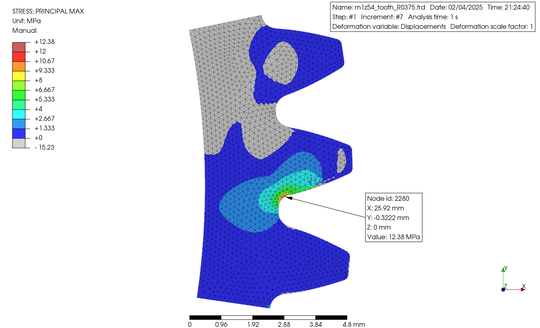 The gear was a spur gear with 1.0 module, 54 number of teeth, and a facewidth of 10 mm. Just 3 teeth among the gear were modeled, the STEP file of the 2D surface was created, and then, the data were imported into PerPoMax. The plane strain analysis was selected in PrePoMax. Finite elements were created and the cut lines were fully constrained. A load of 37.037 N was applied to the node on the pitch circle. The obtained results were shown below in the contour plots.
