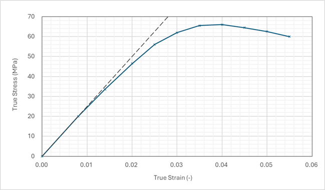 If we observe the stress-strain curve of plastics, the initial slope appears as a straight line. However, as the strain increases, the curve becomes more curved. Therefore, in order to simulate large deformations beyond the range of minute deformations up to the material yield point, a geometrically nonlinear and material nonlinear analysis is required.