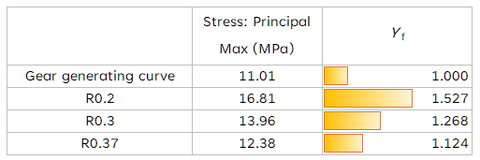 さて今回は JIS B1759「プラスチック円筒歯車の曲げ強さ評価方法」の中で、歯元形状係数 Yf を求めようとした時に PertPoMax を使う例を取り上げてみたいと思います。B1759 には、「歯元形状係数は、歯元すみ肉形状が標準基準ラック (JIS B1701-1) に準拠する場合 Yf = 1.0 とする。」との記載があります。そこで歯元すみ肉形状を歯車の創成曲線とした場合、および R0.375, R0.3, R0.2 とした場合をそれぞれモデリングして解析し、得られた最大発生応力から Yf を算出する試みをしてみました。
